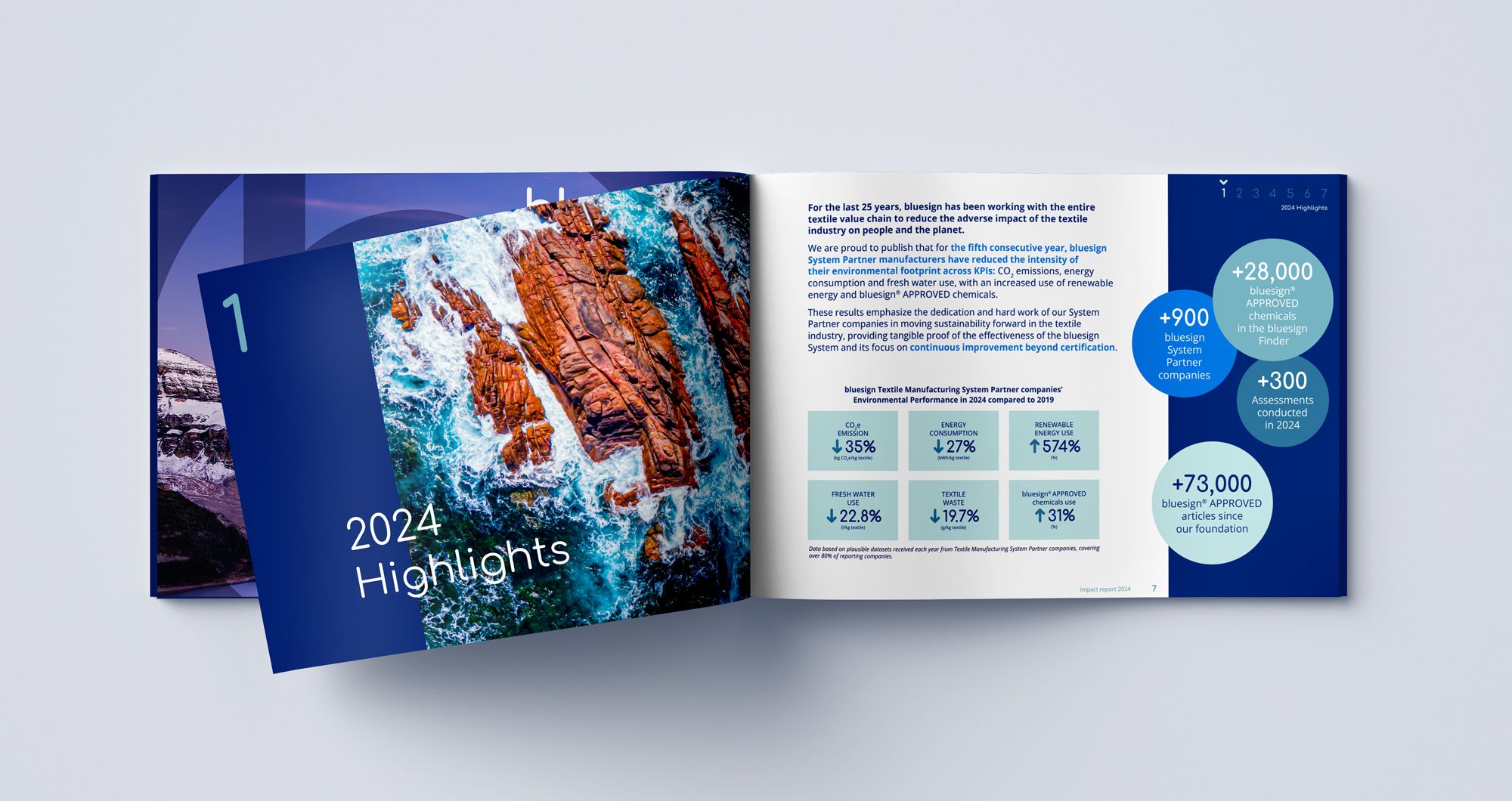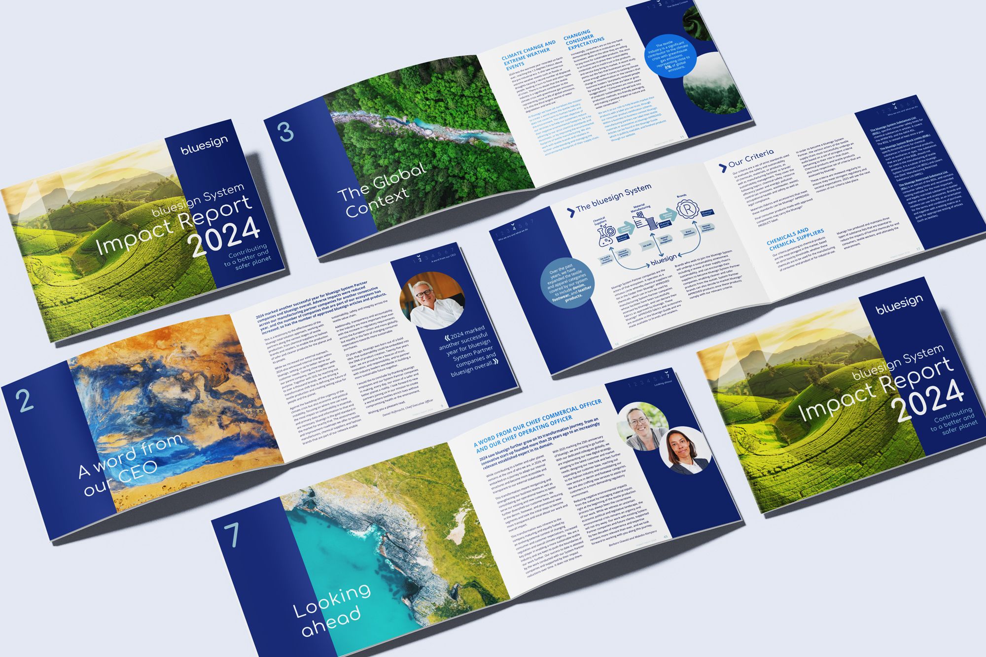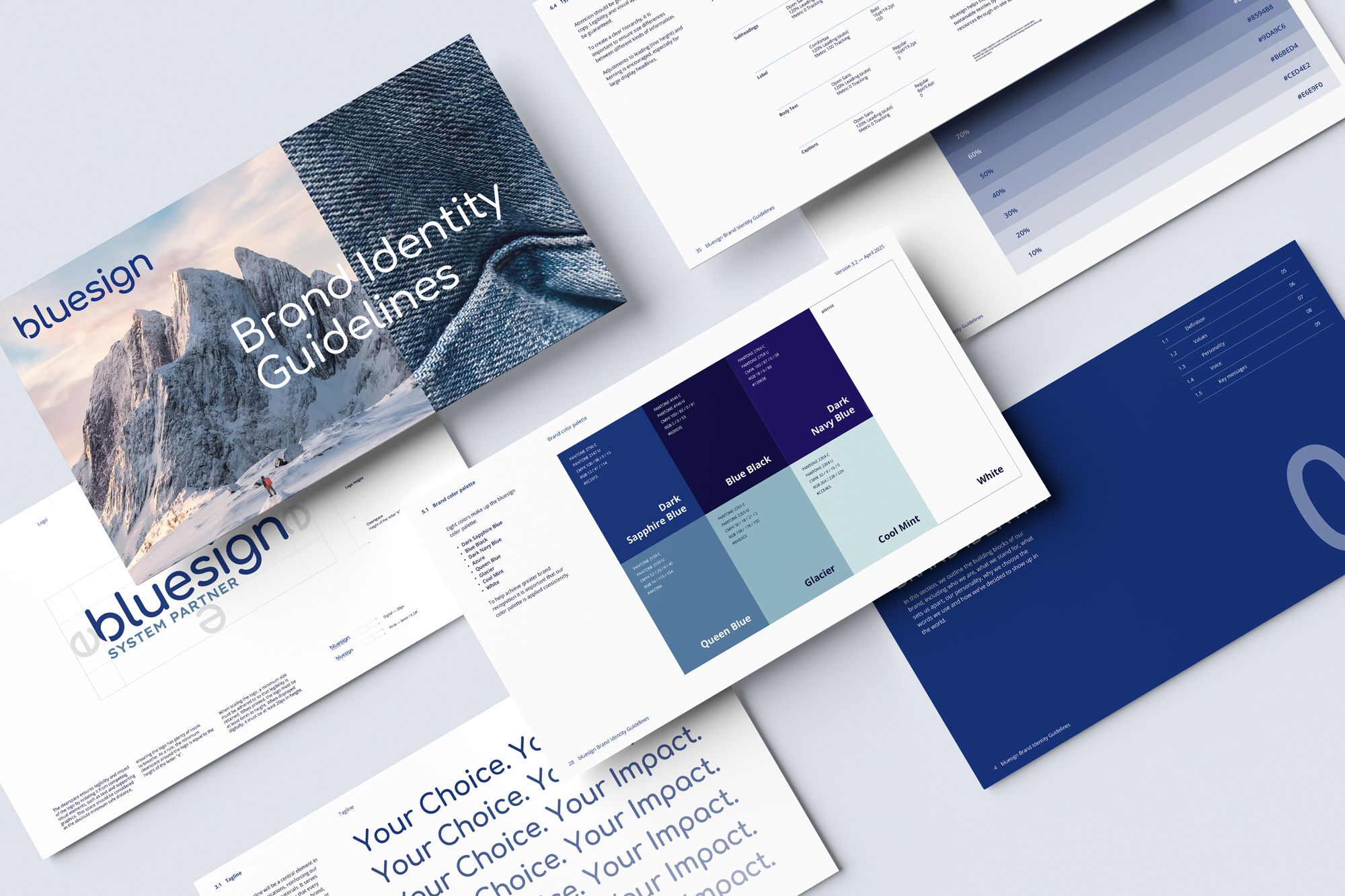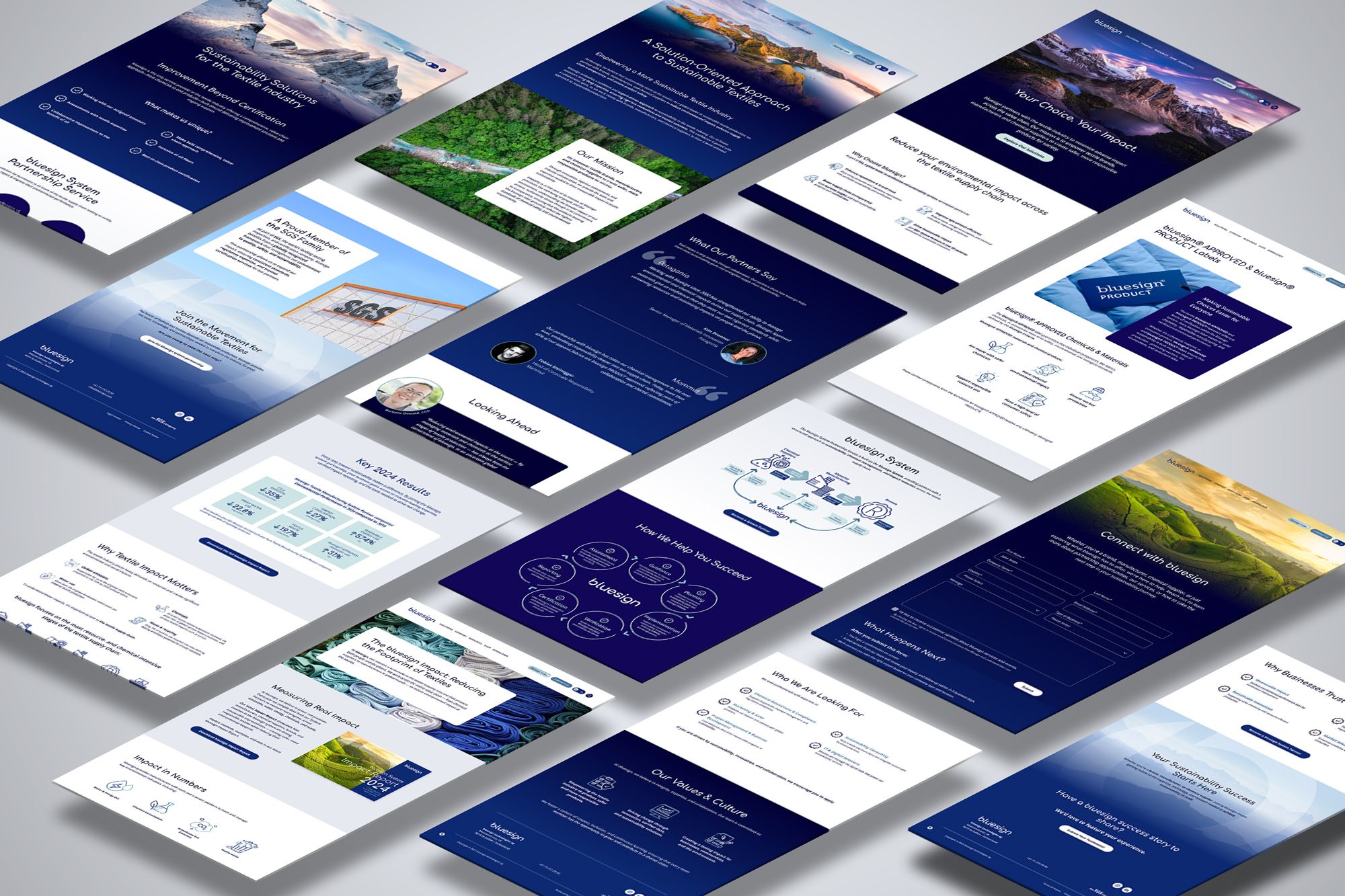 We designed a new brand identity conceived as a strategic system, capable of expressing both the scientific rigor and the human dimension of bluesign. The work focused on the creation of a new logo and a strong, coherent, and scalable visual language, designed to adapt to the complexity of the bluesign ecosystem. A structured brand system was also developed to clearly organize bluesign’s sub-offers and services, reinforcing overall clarity and the brand’s ability to address multiple audiences. At the heart of the identity, a Key Visual concept brings together natural landscapes and textile textures, integrated into the landscapes as a visual continuation. This approach creates an immediate connection between nature and bluesign’s mission, while offering unlimited creative expansion potential and a strong, distinctive brand marker. The identity was then rolled out across all touchpoints, digital and print, to ensure a coherent, recognizable, and lasting brand experience.